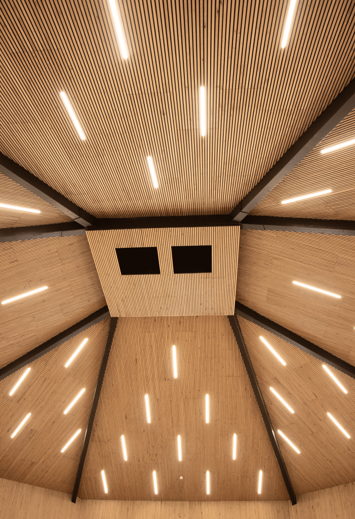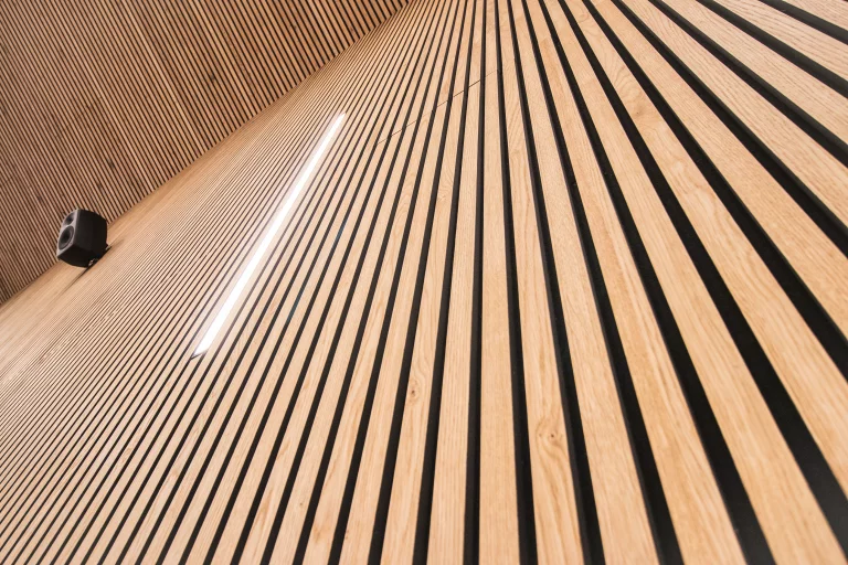 Les panneaux sont installés avec goût au plafond et sur les murs de la vaste zone ouverte, offrant d’excellentes solutions acoustiques.