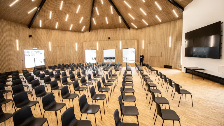 La salle de conférence est dotée d’un vaste espace ouvert au centre, orné de centaines de chaises faisant face à un écran numérique massif, parfait pour les présentations lors des grandes conférences.