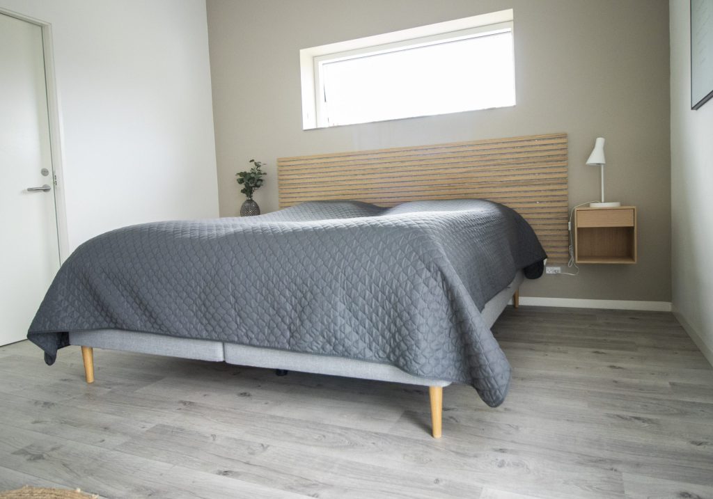 Melissa a fait preuve de créativité en utilisant les panneaux en chêne classique et feutre gris pour créer un magnifique espace, un plafond et une tête de lit, créant ainsi une ambiance cohérente et accueillante dans toute la maison.