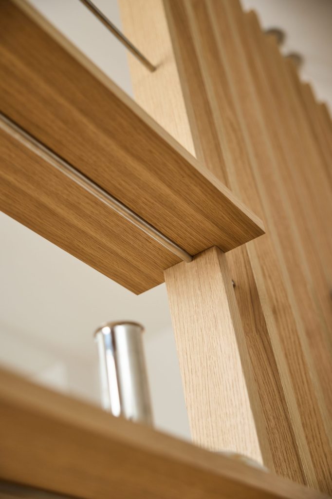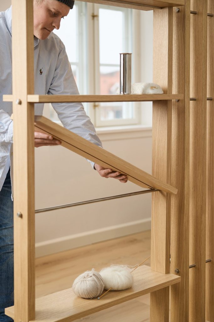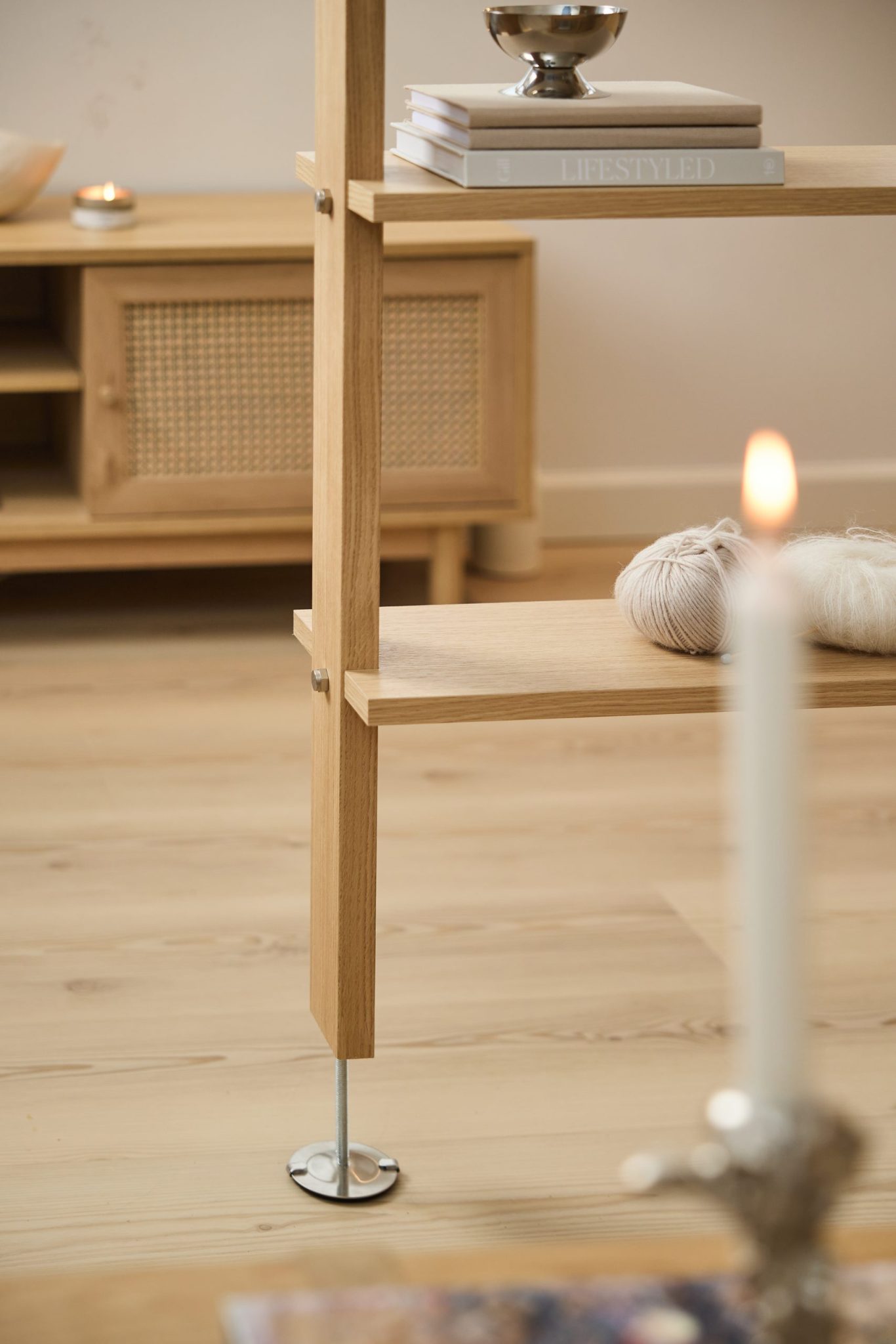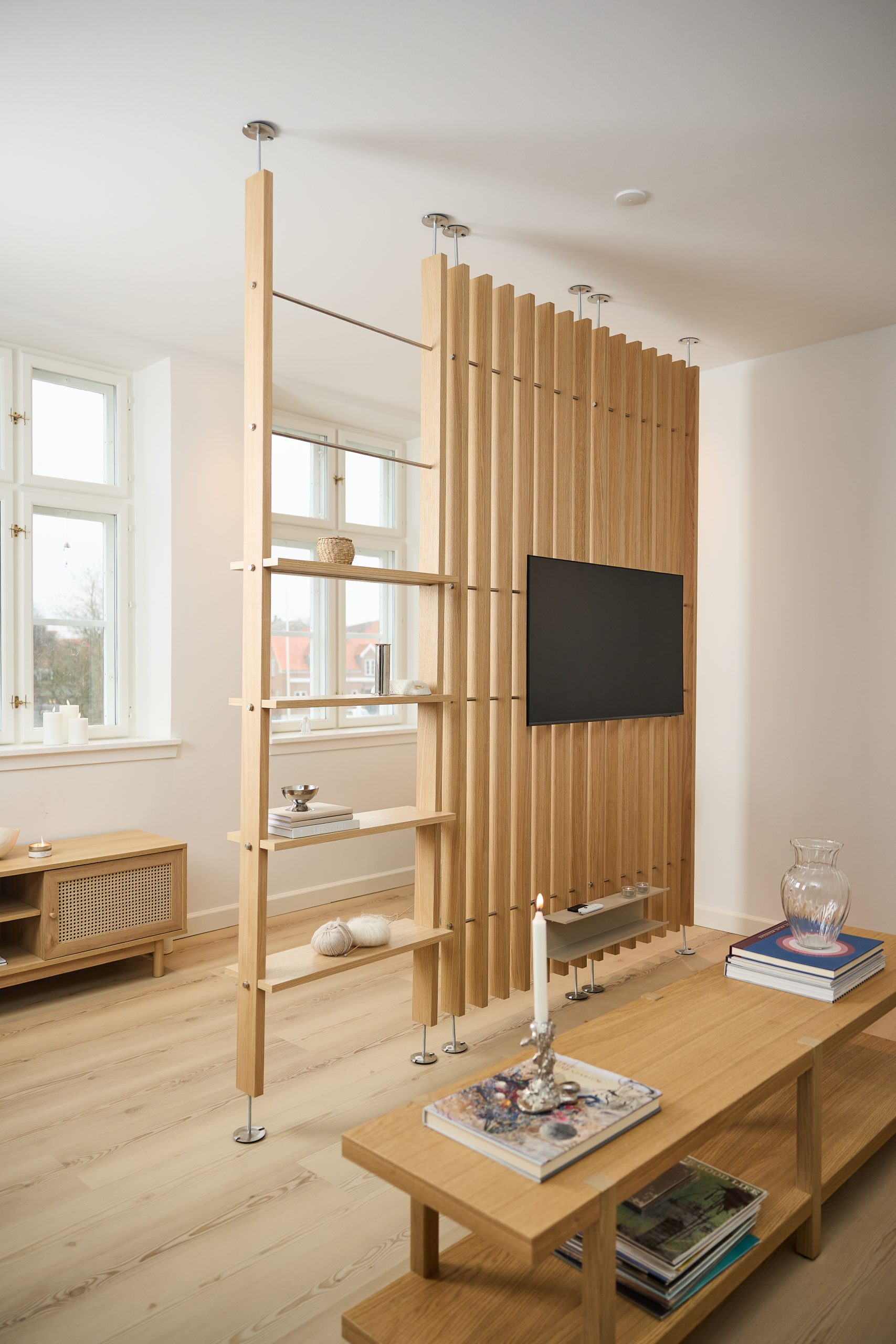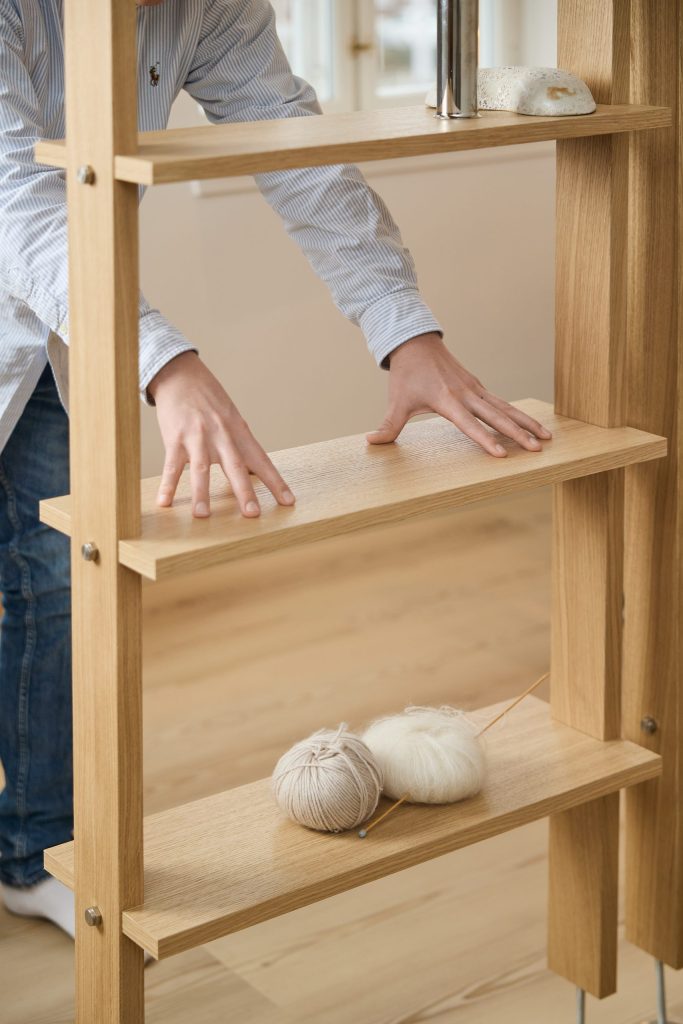 L’étagère en chêne ajoute de la chaleur et contribue à créer une ambiance plus calme dans la pièce. Le bois naturel adoucit l’apparence du séparateur de pièce et ajoute une sensation équilibrée et scandinave.