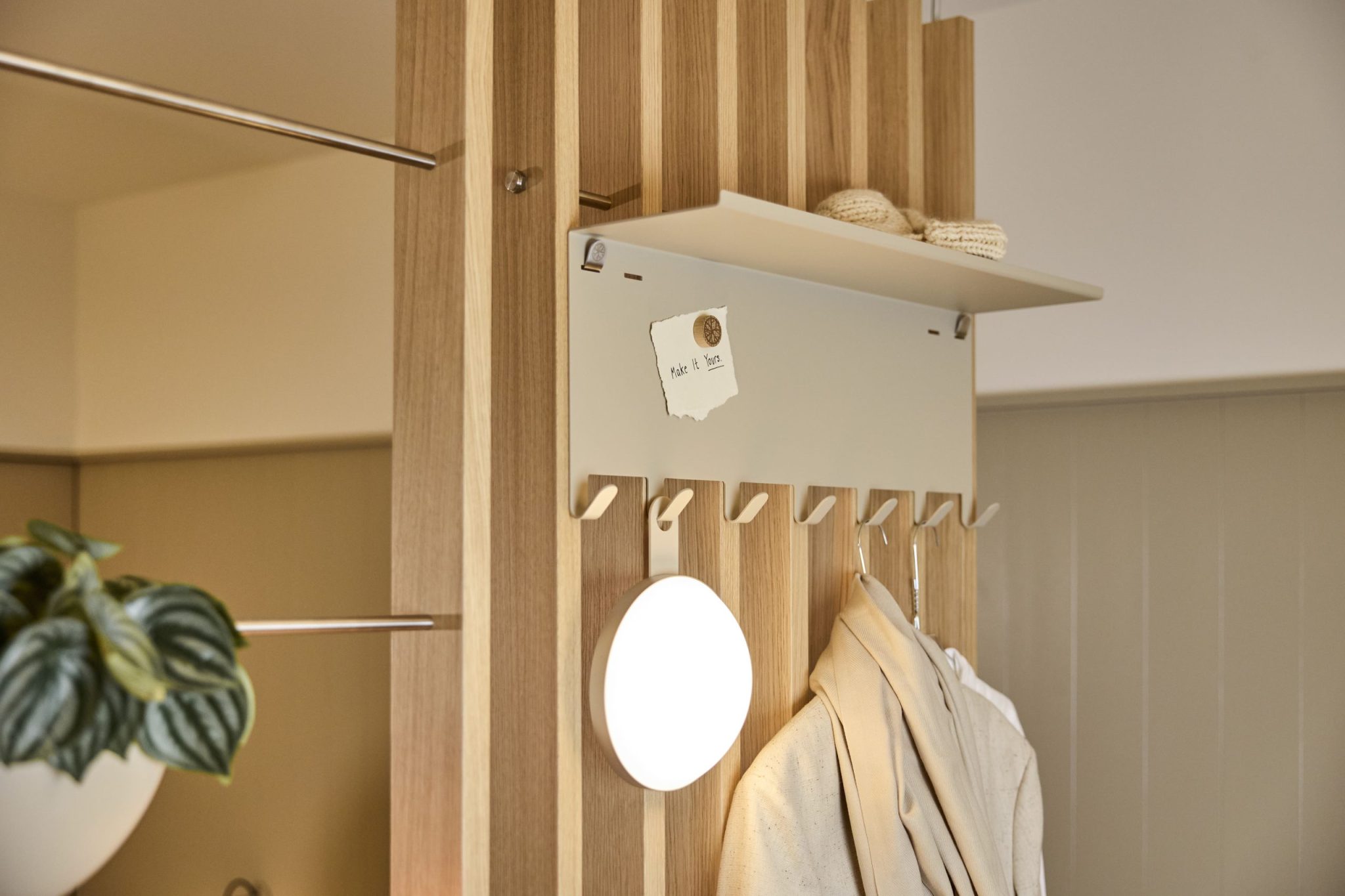 Pas de perçage requis — le porte-manteaux s’intègre à Embrace, pas à vos murs